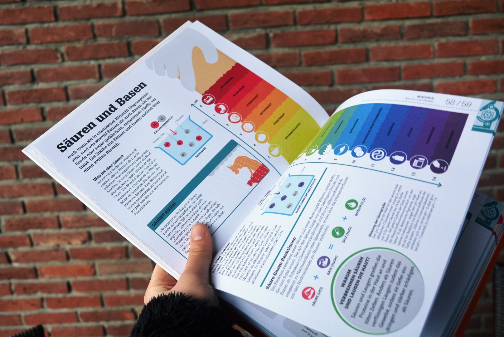 „Naturwissenschaften“ teilt sich in fünf Themenbereiche auf: Materie, Energie und Kräfte, Leben, Weltraum und die Erde. Nach einer kurzen Einführung, warum Wissenschaft denn so wichtig sei, geht es los mit dem ersten Bereich, der Materie. Vom Chemiewissen der Klasse 8 bis zur Quantenwelt findet sich hier alles wieder. Dementsprechend wird hier versucht, für verschiedene Wissensstufen Neues bereit zu halten. Im Bereich der Energie und Kräfte kriegt der Leser Antworten auf Fragen wie „Wie funktioniert eigentlich ein Kopierer?“ oder „Wie wird ein Mikrochip hergestellt?“. Das Buch bietet eine gelungene Abwechslung aus praktischen, aktuellen Themen, also z.B. „VR-Brillen“ oder „Nanotechnologien“ und klassischen Grundlagen wie „Elektrischer Strom“ oder „Magnetkräfte“. Auch hier findet sich Mittelstufenstoff, aber auch die Erklärung der Relativitätstheorie oder der Stringtheorie.