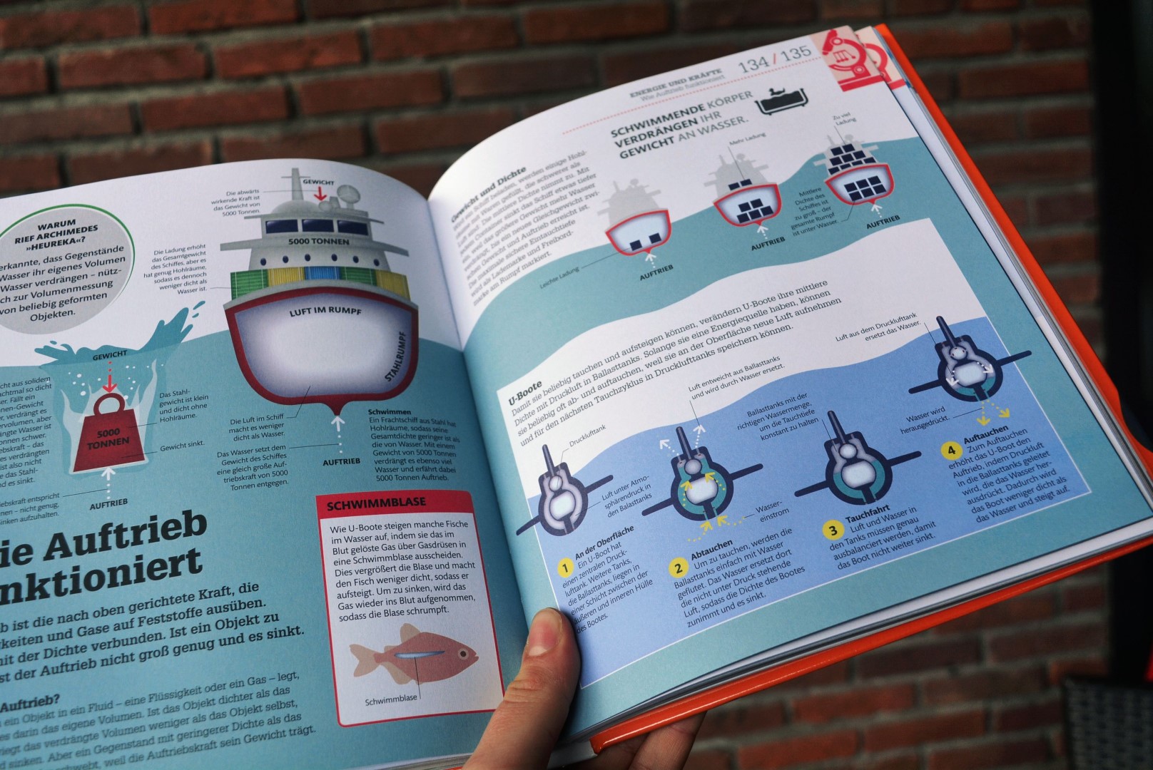 Im Abschnitt „Leben“ kommen die Biologen zum Zug: Von Viren, Genen, Vererbung oder dem Klonen finden sich hier verschiedenste spannende Themen. Auch der Bereich „Weltraum“ ist besonders toll graphisch aufgemacht, anschaulich wird erklärt, was schwarze Löcher oder dunkle Materie sind oder wie das Leben im Weltall abläuft. Im letzten Teil des Buches wird dann noch einmal auf die Erde eingegangen. Von der Erdatmosphäre, Treibhauseffekten und dem Klimawandel, hier kommt jeder Erdkundefan auf seine Kosten.