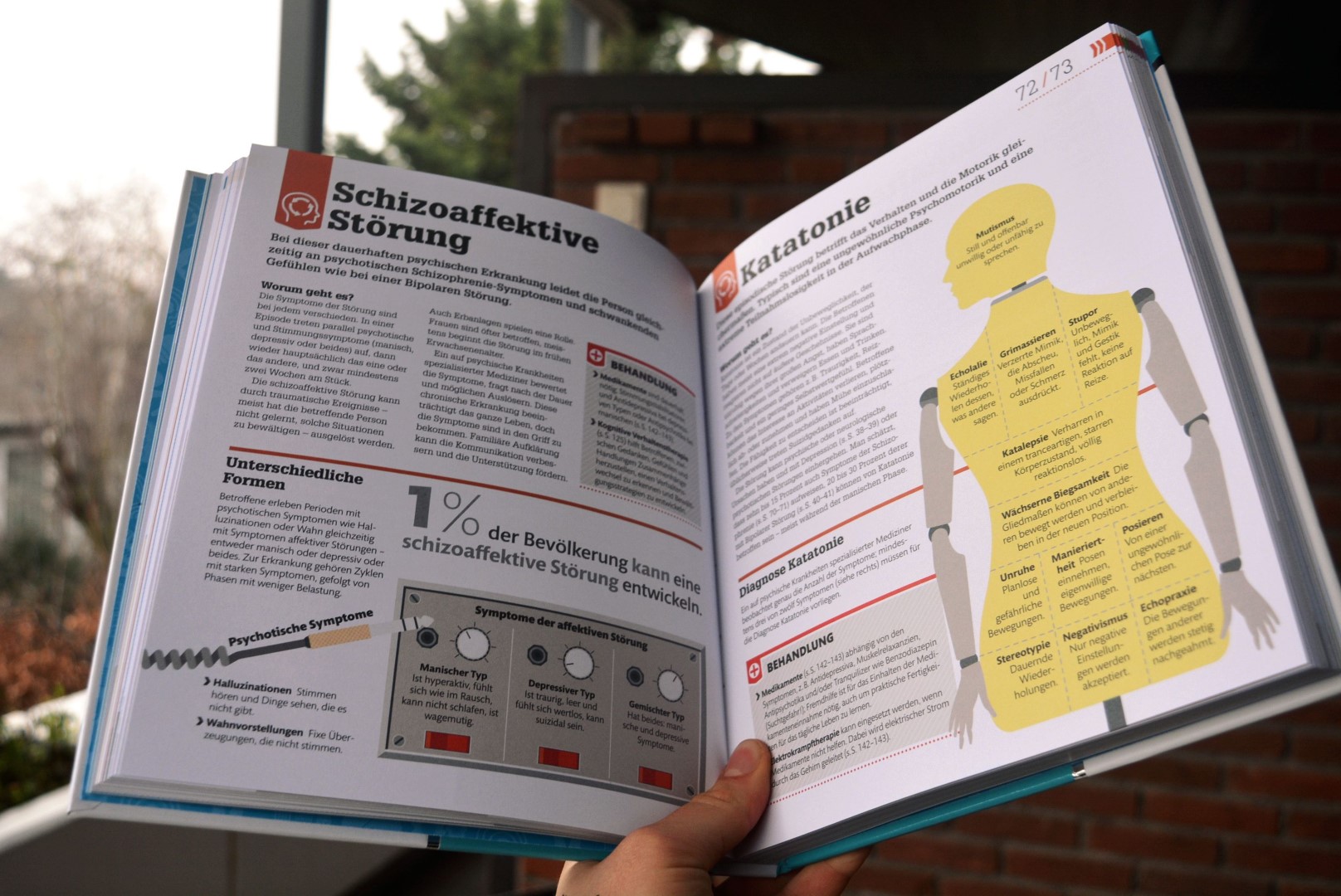 Im großen Kapitel „Psychische Störungen“ werden verschiedene Krankheitsbilder auf einer oder zwei Seiten vorgestellt. Aufgeteilt ist dabei jede Krankheit in die Abschnitte „Worum geht es?“, „Wie erfolgt die Diagnose?“ und Behandlung“. Ich persönlich blätterte durch diesen Teil nur durch, doch wer einen kurzen Überblick über zahlreiche psychische Krankheiten haben möchte, wird sich an diesem Teil des Buches erfreuen. Auf die Krankheiten folgt die Vorstellung von Therapiemöglichkeiten.
