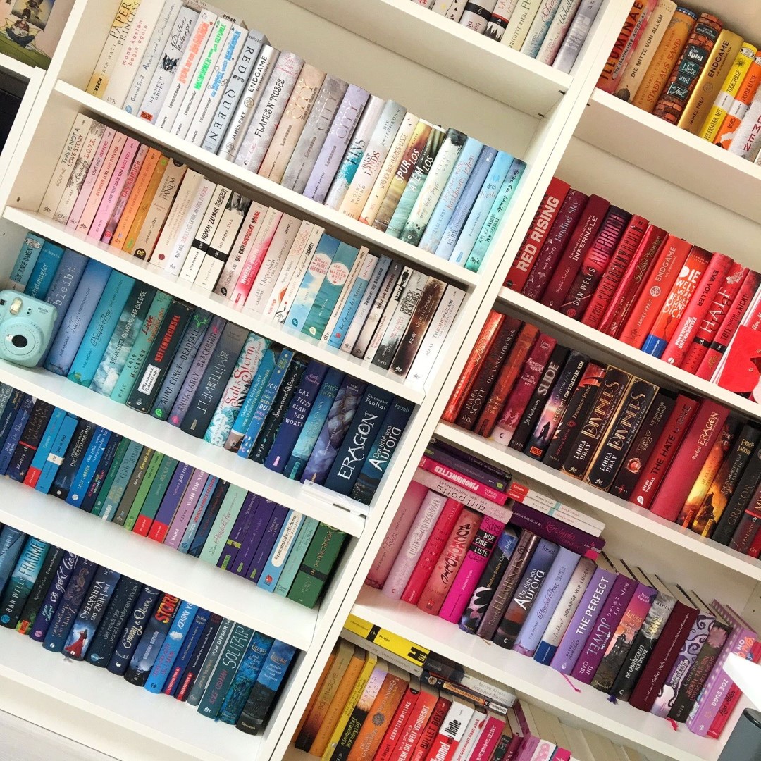 Es ist fraglich, wie praktisch das System letztendlich ist, denn so musste ich einige Reihen leider trennen. Vorher war ich außerdem darauf bedacht, Bücher eines Autors aneinander stehen zu haben. Auch das ist so nicht mehr möglich. Dafür muss man aber sagen, dass ein nach Farben geordnetes Bücherregal wirklich ein Blickfang ist und gleich deutlich aufgeräumter und strukturierter wirkt.